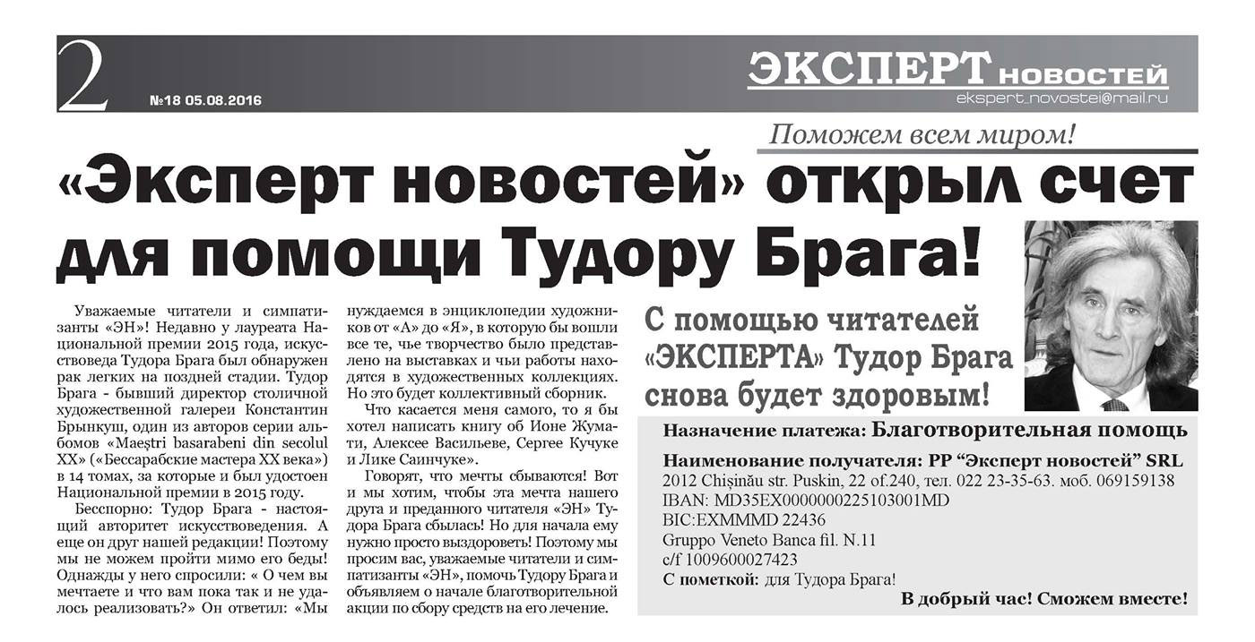 Уважаемые читатели и симпатизанты «ЭН»! Недавно у лауреата Национальной премии 2015 года, искусствоведа Тудора Брага был обнаружен рак легких на поздней стадии. Тудор Брага — бывший директор столичной художественной галереи Константин Брынкуш, один из авторов серии альбомов «Maeştri basarabeni din secolul XX» («Бессарабские мастера ХХ века») в 14 томах, за которые и был удостоен Национальной премии в 2015 году.